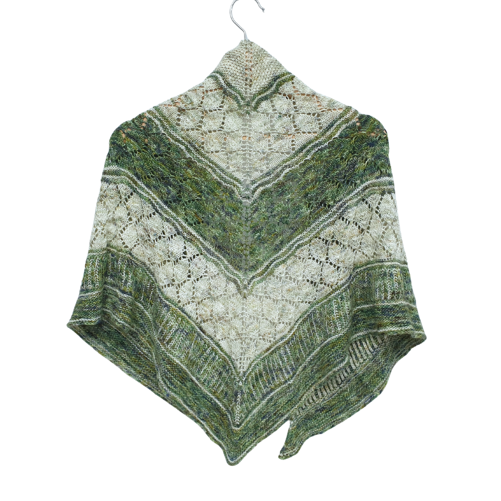 This shawl was born as part of a collaboration with Jen from Stitch Street Crochet where we both designed a shawl, mine knit and hers crochet, from the same inspiration using the same yarns. The yarns chosen are Enchanted Forest and Chesil Beach on Selkino, a merino silk singles yarn which a lovely drape that is ideal for knitting or crochet. Each section has been designed to remind me of an aspect of trees and forest from the ‘Broccoli’ look of the top of a forest from a distance to the leaves and trunks of the trees down to the ground below.