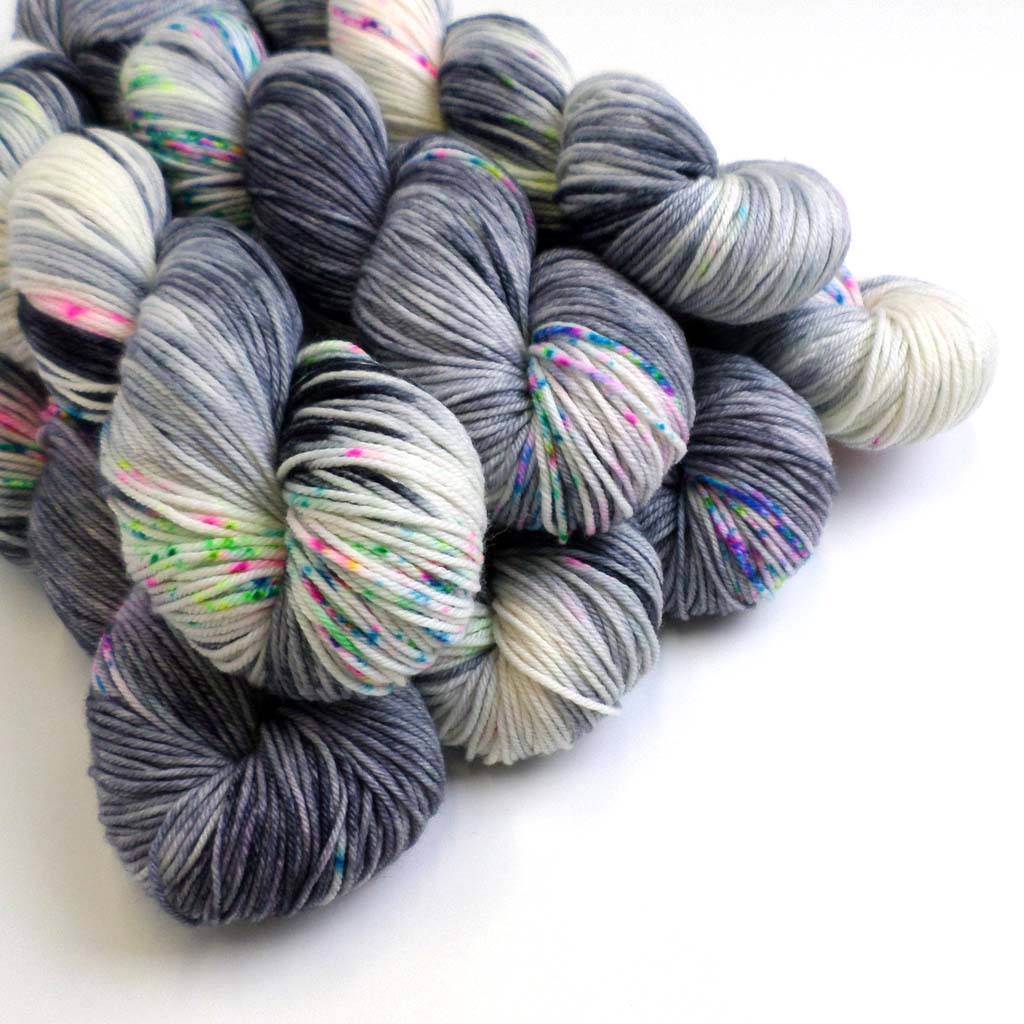 Charcoal grey and undyed white with neon speckles of pink, blue, yellow and green.