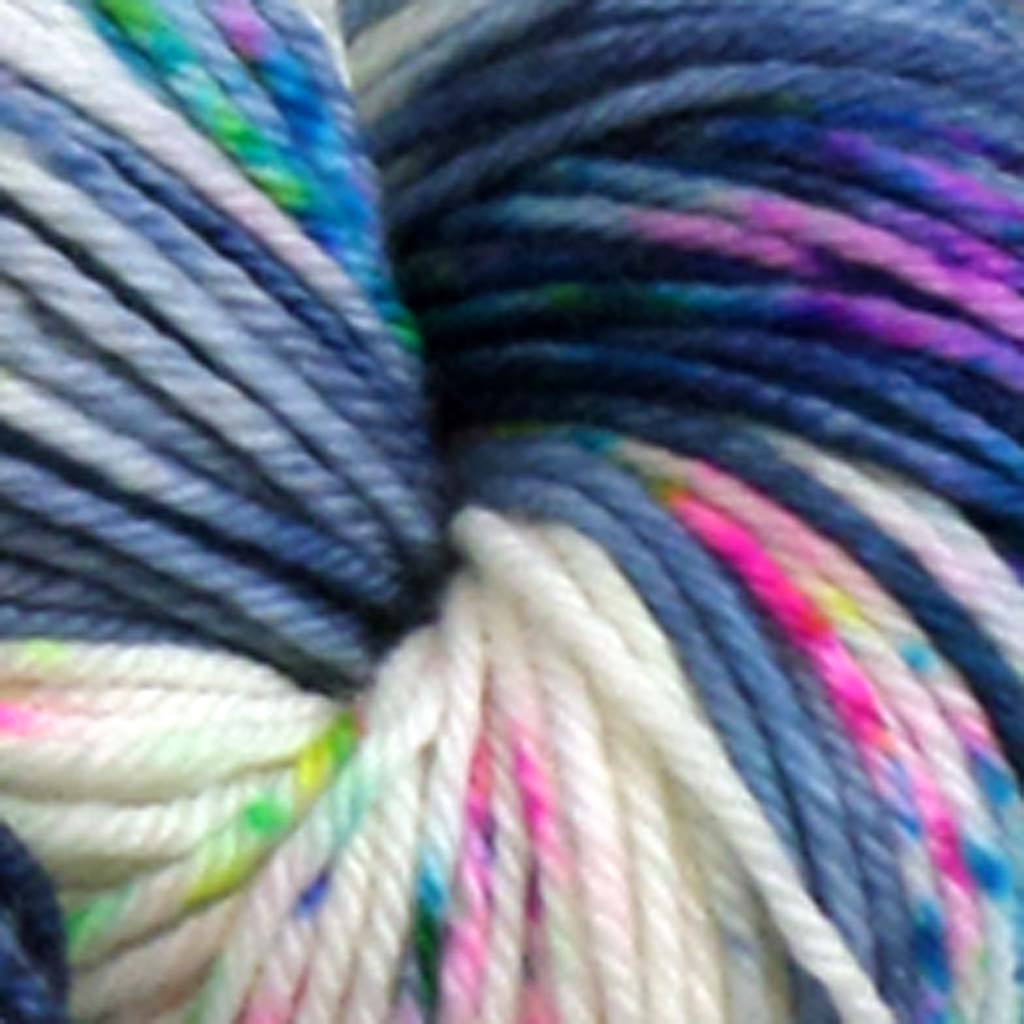 Midnight blue and undyed white yarn with neon speckles of pink, blue, yellow and green.