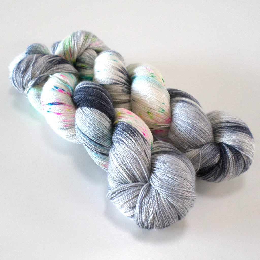 Charcoal grey and undyed white with neon speckles of pink, blue, yellow and green.