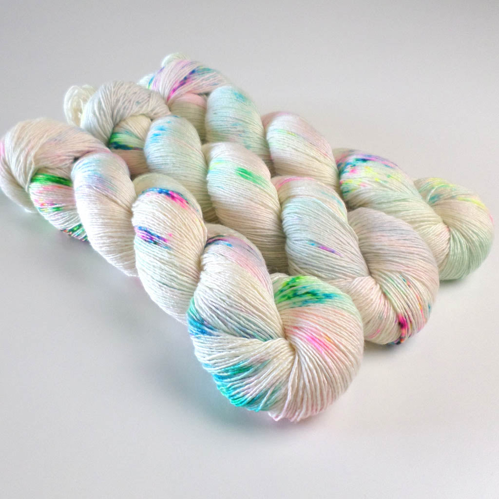 Neon speckles of pink, blue, yellow and green on undyed white yarn.